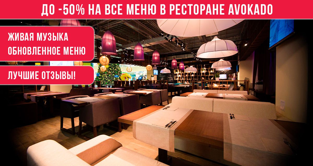 Купон дает право скидки 50% на все блюда кухни, пенные и безалкогольные напитки, также 30% на алкогольные напитки и 40% на паровые коктейли в ресторане Avokado.
