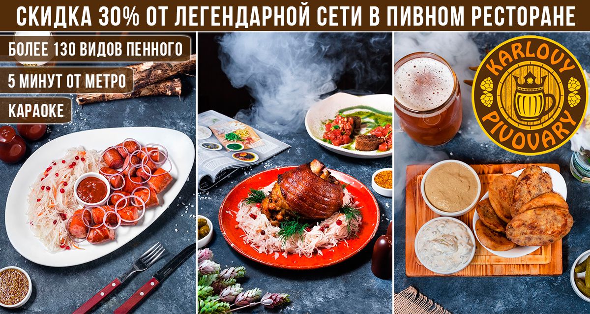 Купон дает право скидки 30% на все меню и напитки, кроме пивного бутика, в пивном ресторане KARLOVY PIVOVARY.