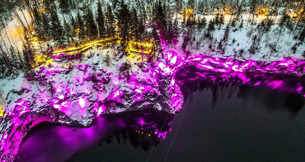 — зимняя сказка — природа Карелии: водопады, Рускеала в огнях.