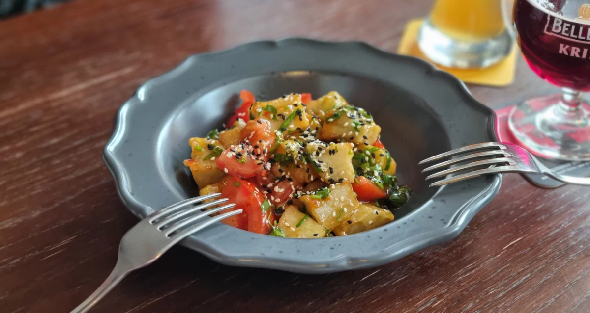 — теплый салат с хрустящими баклажанами — 406 р.;