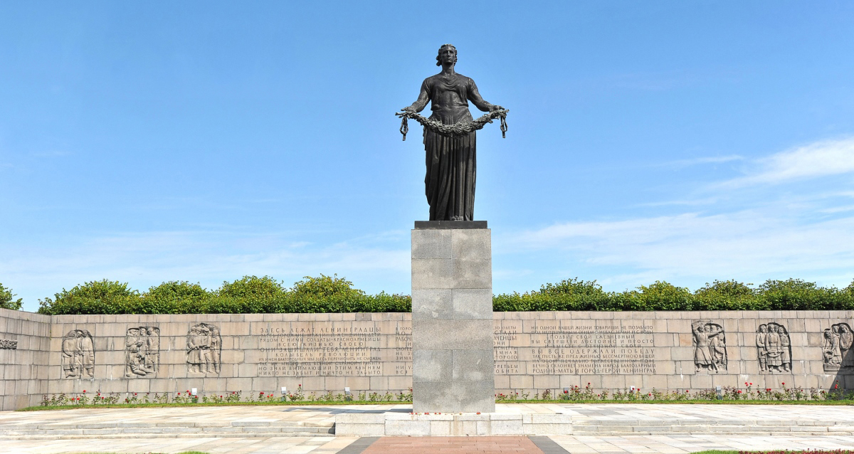 — первая остановка экскурсии — Пискаревское мемориальное кладбище: трехсотметровая памятная аллея, вечный огонь, величественный монумент скорбящей Родины-Матери;