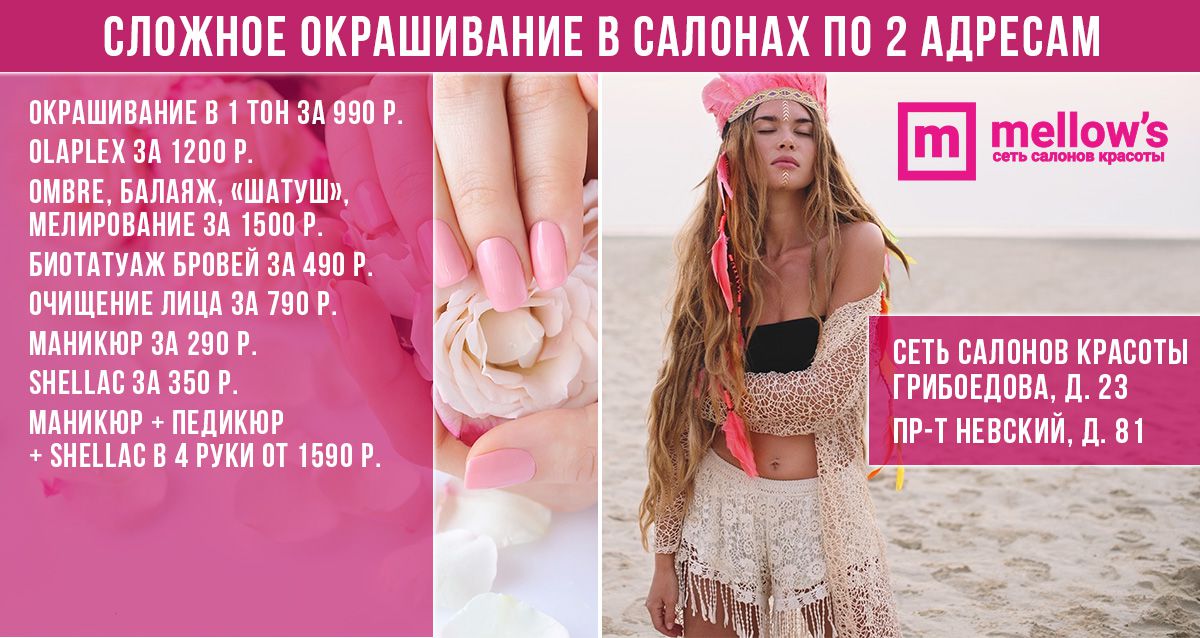 Команда bOombate 8 лет назадЗдравствуйте! Адрес указан в купоне и в условиях акции. Сеть салонов красоты Mellow's: наб. канала Грибоедова, д. 23, тел.: 7 812 425-63-38 и Невский пр-т, д. 81, тел.: 7 812 425-14-85: